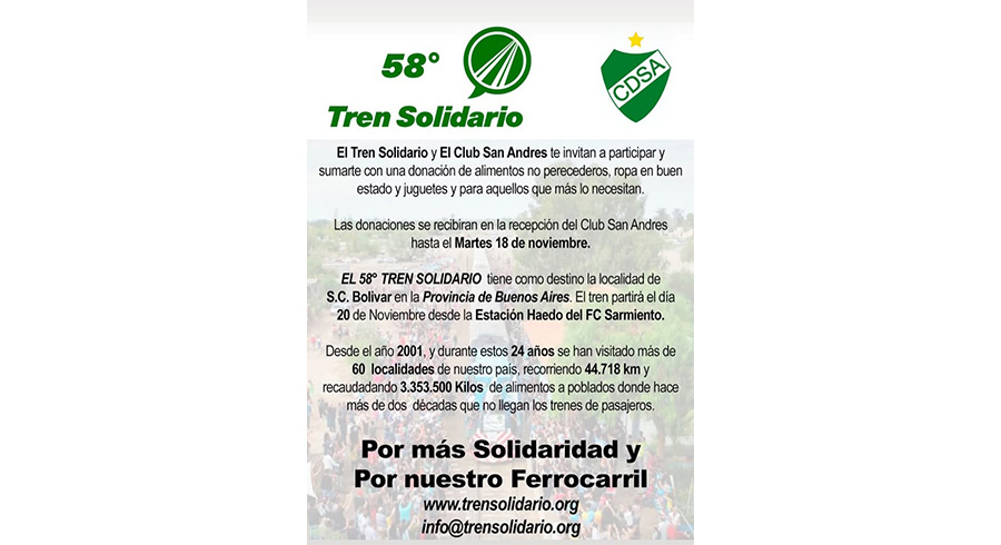 El Tren Solidario y el Club Deportivo San Andrés invitan a los vecinos a sumarse con una donación de alimentos no perecederos, ropa en buen estado y juguetes para aquellos que más lo necesitan.