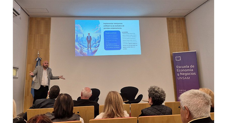 El Rotary Club San Andrés de General San Martín junto con la Cámara Empresaria de General San Martín realizaron una charla sobre la desmitificación de la inteligencia artificial y el impacto de los asistentes de la IA en la actividad empresarial. El encuentro en el Escuela de Negocios de la UNSAM fue liderado por Patricio Rouan, asesor de la Sociedad Argentina de Inteligencia Artificial, quien se refirió a la singularidad tecnológica y la ventaja competitiva de las organizaciones que adopten la IA, que serán las que lideren el mundo que viene.